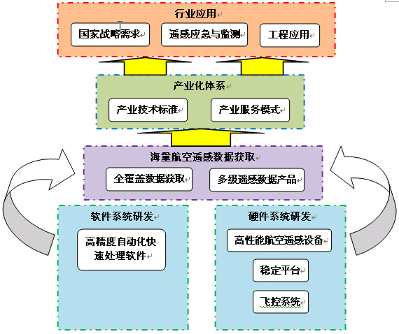 聚集国内航空遥感设备制造商与工程服务企业、高校、研究院所,形成优势互补,强强联合的航空遥感产业链,构建航空遥感自主创新体系和集团化运行服务体系,通过市场需求牵引和国家科技投入为导向,逐步具备多类型、高性能航空遥感设备制造与集成能力,多级遥感数据产品快速处理软件研发能力,覆盖全国的航空遥感数据获取能力,高精度空间信息产品加工与服务能力,推动我国航空遥感产业的快速有序发展。