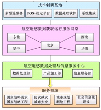 航空遥感联盟的业务体系由技术创新基地、航空遥感数据获取运行服务网络、航空遥感数据处理与信息服务中心三部分构成。
